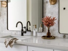 Melissa capitalized on the house’s strong bones by keeping the basic living room structure with its parallel side corners. She removed the TV nook above the fireplace with a piece drywall, and framed it in trim. She added slipcovered Ethan Allen couches and Pottery Barn leather chairs to create a classic feel. Sherwin Williams’ grays in close shades (Agreeable Gray Chelsea Gray and Dorian Gray), which are all similar, complete the traditional and stately feel of this living room.